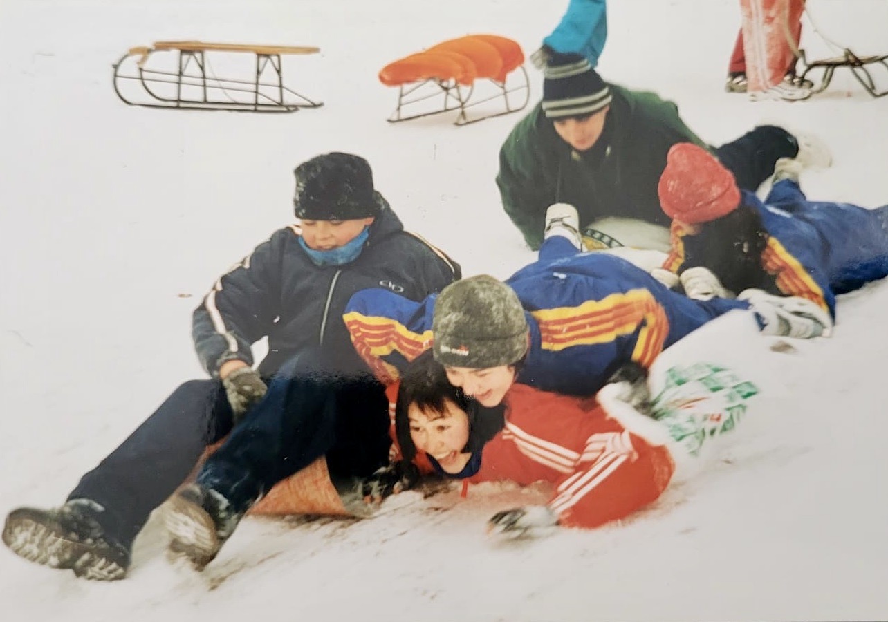 “With the girls from the National Training Center. There was a forest near our residence and we spent our weekends playing in the snow.”