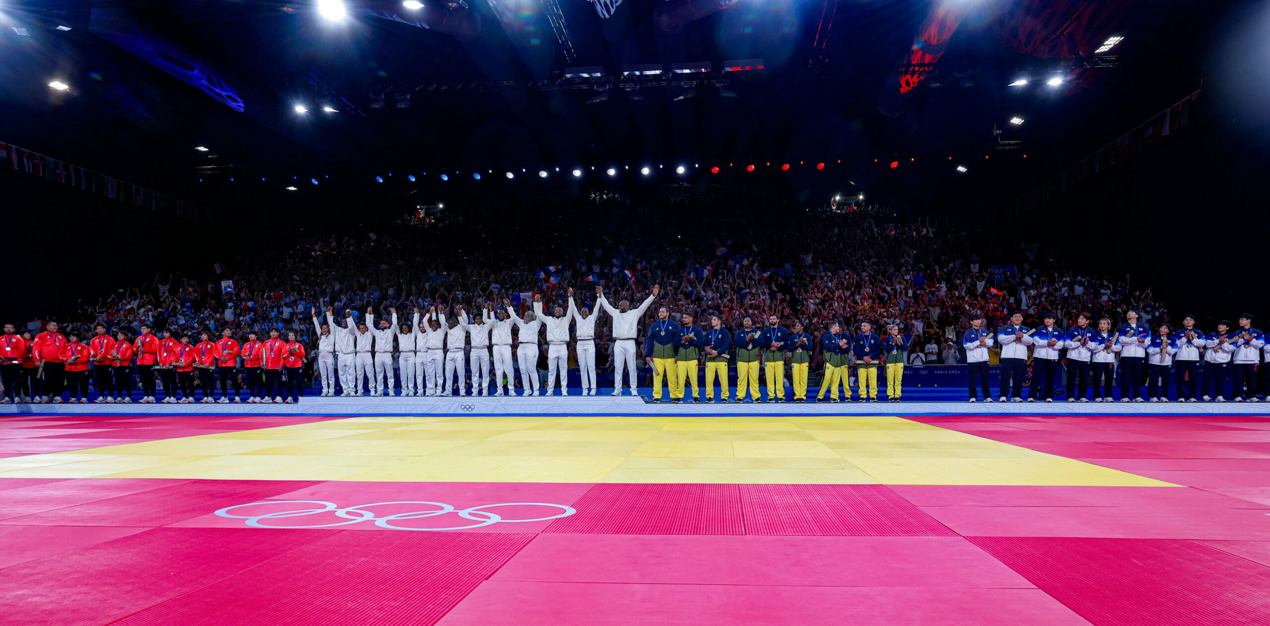 Deux images qui resteront ? La golden de Joan-Benjamin Gaba, dos au mur face à la légende Hifumi Abe, brisant une barrière mentale collective et justifiant la foi en lui depuis des années et contre vents et marée de l’entraîneur Baptiste Leroy, le temps d’une célébration qui chavira la France entière aussi intensément que la volée de Kylian Mbappé qui amena le 2-2 face à l’Argentine en finale de la Coupe du monde 2022 de football. L’autre image est celle de l’impatience des douze protagonistes à en découdre à nouveau au moment d’attendre debout alignés sur le tapis, les yeux des uns dans les yeux des autres, le résultat de la roulette numérique à la neutralité présupposée, actionnée sur l’écran géant d’une Arena Champ-de-Mars en fusion, désignant quelle catégorie était appelée par Dame Destinée à y retourner, le temps d’un golden score de la muerte. Ce fut celle des +90 kg. Celle du taulier de 35 ans face à son cadet de treize années qu’il venait de dominer par ippon au terme d’un étouffant golden score. L’illustration parfaite de l’adage de ces mantras de Jigoro Kano tels qu’ils sont rapportés dans la Bible Le Judo, école de vie de Jean-Lucien Jazarin : « Toute victoire qui n’entraîne pas la transformation du partenaire, n’est qu’une apparence et une illusion. Vaincre sans convaincre n’est rien. » Teddy Riner est assez constant dans son message depuis dix-huit saisons à présent. L’équipe de France par équipes mixtes l’est également depuis deux olympiades. Le Guadeloupéen prit une fois de plus ses responsabilités. Le ippon fut à nouveau le tarif, entraînant une liesse collective immense et l’expression, une fois encore, de l’infinie dignité nippone, les six battus prenant le soin de saluer en ligne le tapis en sortant malgré les réserves que tout battu peut légitimement nourrir vis-à-vis de l’arbitrage contemporain, a fortiori dans un climat aussi passionné. Le reste ? L’ovation sur le podium pour Gaba (mérité) et Saito (méritant), les polémiques sur les réseaux sociaux sur l’absence de « diversité » (entendre : blanche) de l’équipe de France 2024 – quid alors de celle du Japon ? Tout cela n’est pas très important et relève davantage du temps long du sociologue et de l’historien que du journalisme du moment présent. L’important est que trois femmes, trois hommes, deux entraîneurs et leurs homologues japonais en miroir et en fierté se soient donnés la main pour essayer, apportant ce faisant un peu de joie, de liant et d’unité à un pays et une époque qui en avaient bien besoin. Le reste, tout le reste, est anecdotique. – Anthony Diao. Photo d’ouverture : Tamara Kulumbegashvili – IJF/JudoAKD.