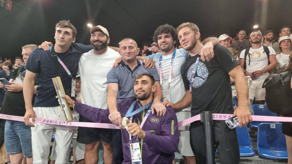 Paris, August 1, 2024. Team Vladikavkaz in the stands of the Arena Champ de Mars: around Zelym Kotsoiev, fresh U100kg Olympic champion for Azerbaijan, his younger brother Aslan, Inal Tasoev, his coach Irbek Viktorovich Aylarov, Theódoros and the U73kg from the United Arab Emirates Karim Abdulaev (brother to UFC champion Islam Makhachev). ©Theódoros Tselídis Archives/JudoAKD