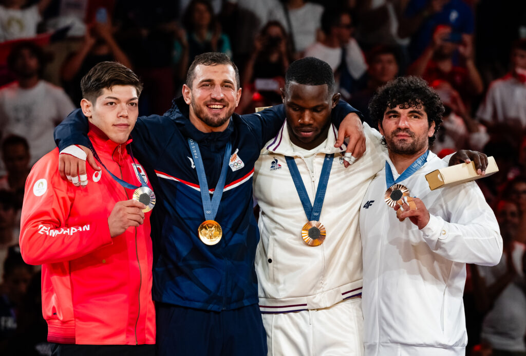 Paris, July 31, 2024. An Olympic U90kg podium to show later to the grandchildren in When We Were Kings mode, alongside Japanese Sanshiro Murao (2nd), Georgian Lasha Bekauri (1st) and Frenchman Maxime-Gaël Ngayap Hambou (3rd). ©Paco Lozano/JudoAKD
