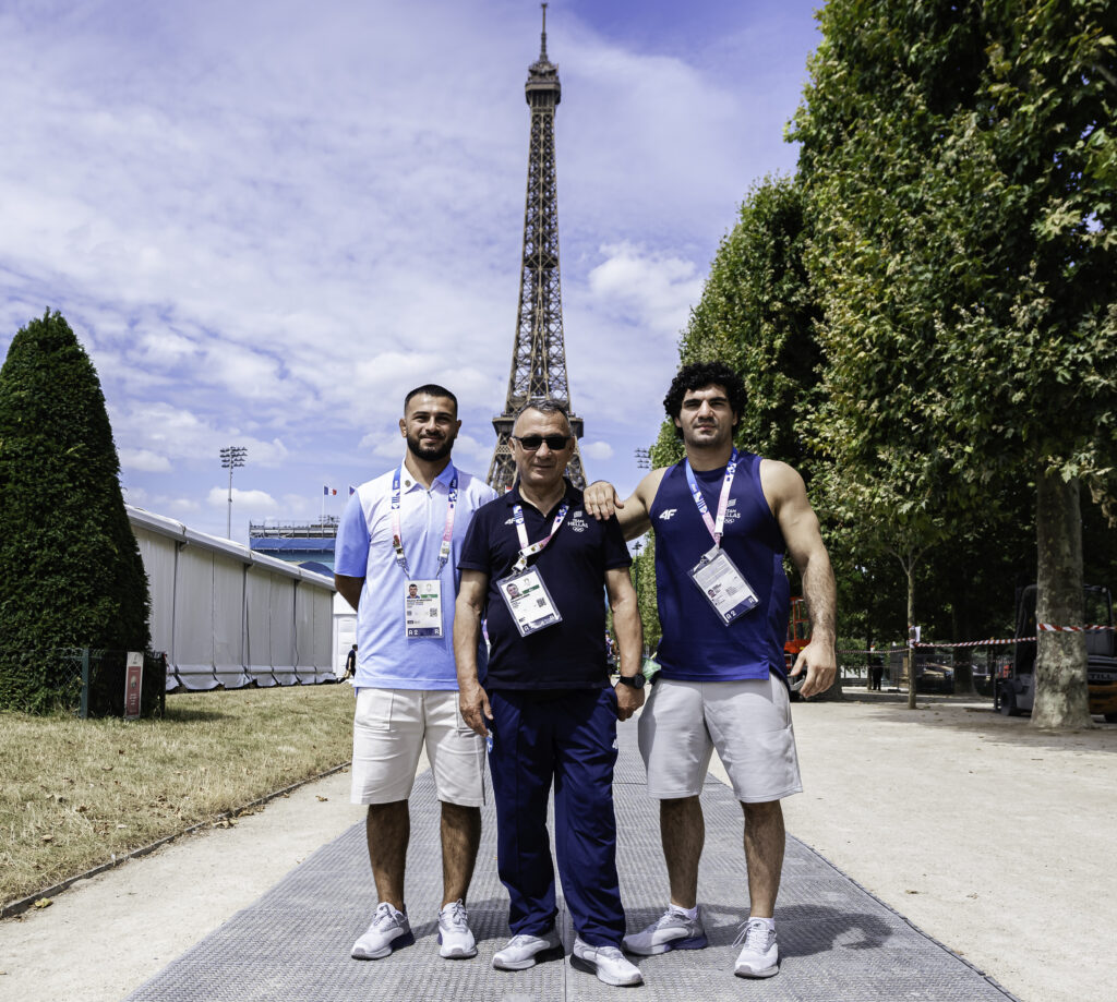 Paris, August 2024. Near the Arena Champ-de-Mars alongside his coach Nikos Iliadis and former junior World champion Alexios Ntanatsidis. ©Paco Lozano/JudoAKD
